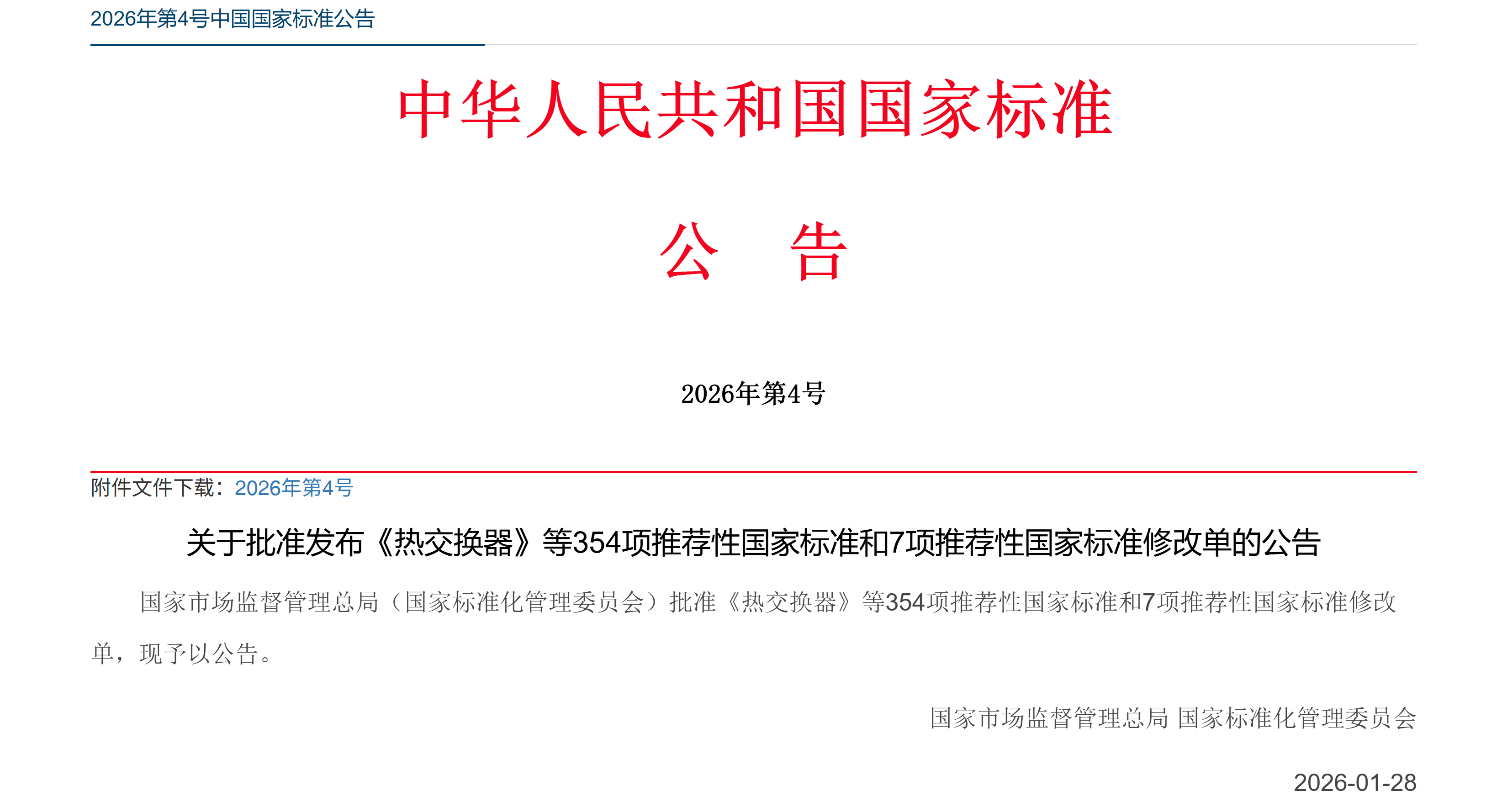 2026年1月28日,国家市场监督管理总局、国家标准化管理委员会发布2026年第4号《热交换器》等354项推荐性国家标准和7项推荐性国家标准修改单的公告,其中包括由全国物流标准化技术委员会提出并归口的《绿色物流指标构成与核算方法》(GB/T 37099—2026)国家标准。