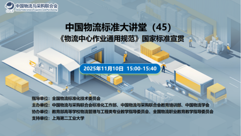2025年11月10日,在全国物流标准化技术委员会的指导下,中国物流与采购联合会标准化工作部和教育培训部、中国物流学会共同主办了“中国物流标准大讲堂”第45期——《物流中心作业通用规范》(GB/T 22126—2025)国家标准宣贯活动。本次活动共有1300余人次在线参加。