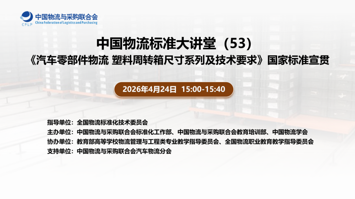 2026年4月24日,在全国物流标准化技术委员会的指导下,中国物流与采购联合会标准化工作部和教育培训部、中国物流学会共同主办了“中国物流标准大讲堂”第53期活动,对《汽车零部件物流 塑料周转箱尺寸系列及技术要求》(GB/T 31150-2025)国家标准进行宣贯,1450余人次在线参加。