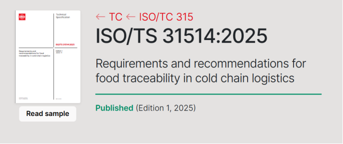 2025年11月4日,由中国联合新加坡牵头制定的《冷链物流中食品可追溯性的要求和建议》(ISO/TS 31514:2025)正式由国际标准化组织(ISO)发布。是我国在国际标准化组织冷链物流技术委员会(ISO/TC 315)牵头制定的第3项国际标准。